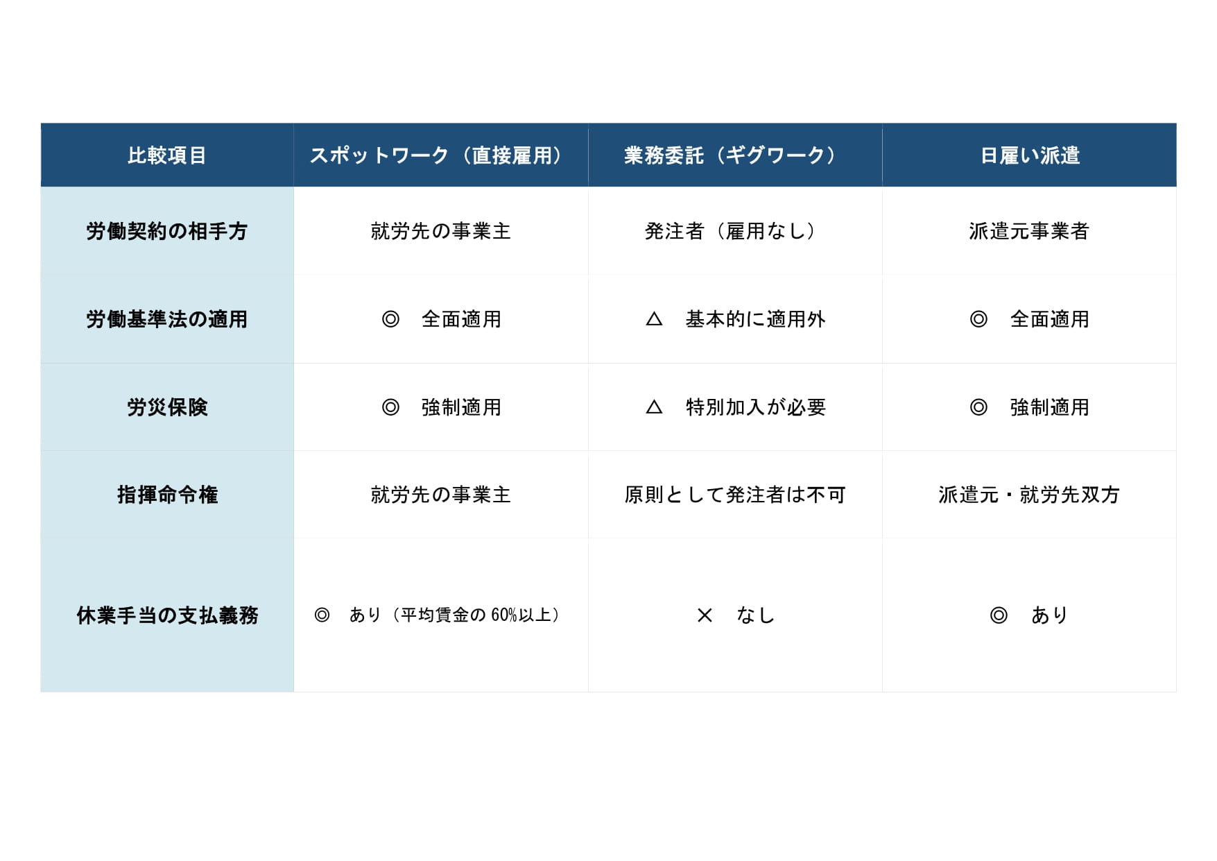 スポットワークと混同されやすいのが「業務委託(ギグワーク)」や「日雇い派遣」です。これらは制度の根拠が全く異なり、誤った認識で運用すると「偽装請負」や「違法派遣」として重大な法令違反に問われる危険があります。以下の比較表で、それぞれの違いを整理してください。