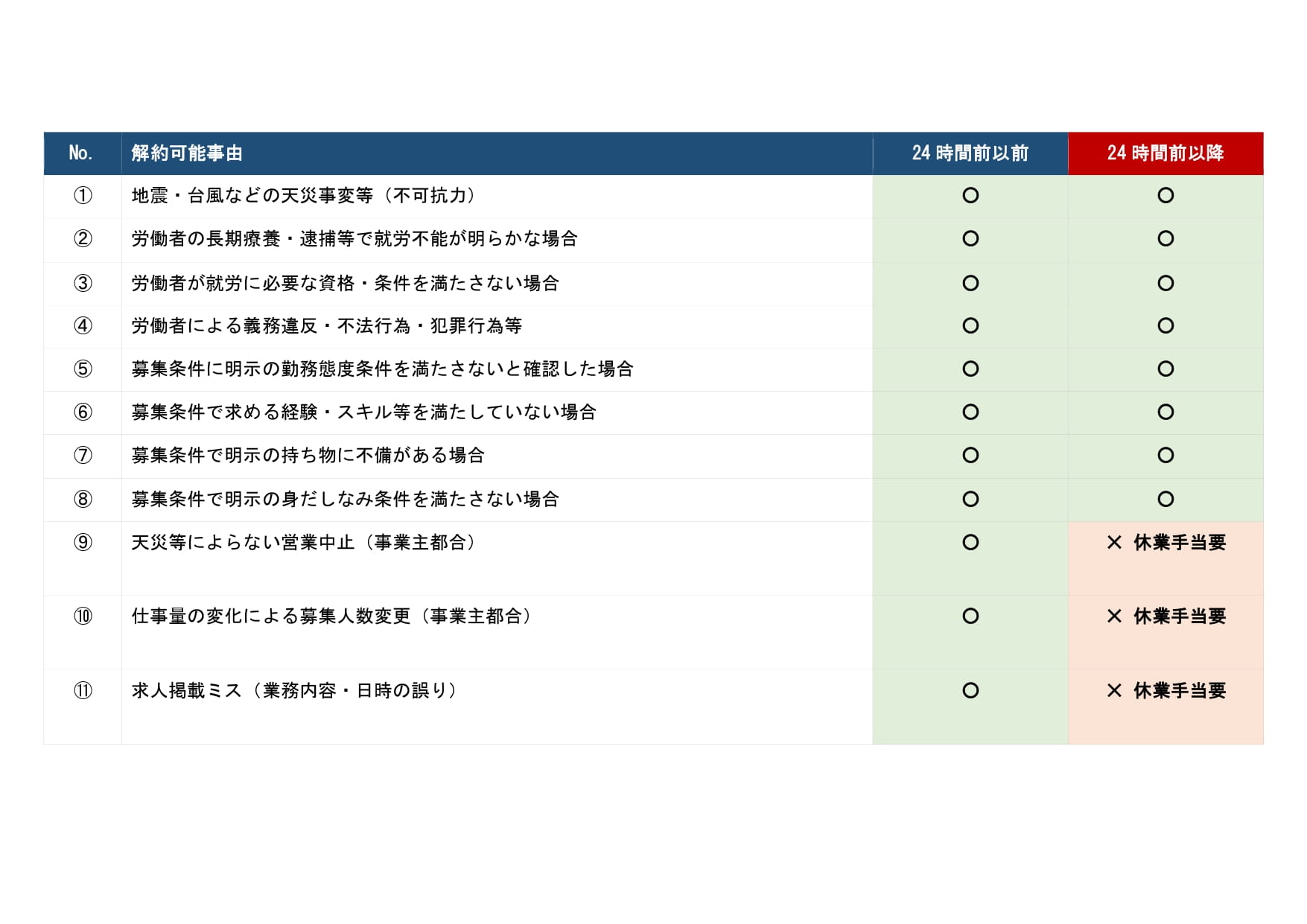 スポットワーク協会の「解約権留保付労働契約」導入に伴い、事業主が休業手当なしに解約できる事由と、就労開始24時間前を境とした適用範囲の違いは以下の通りです。