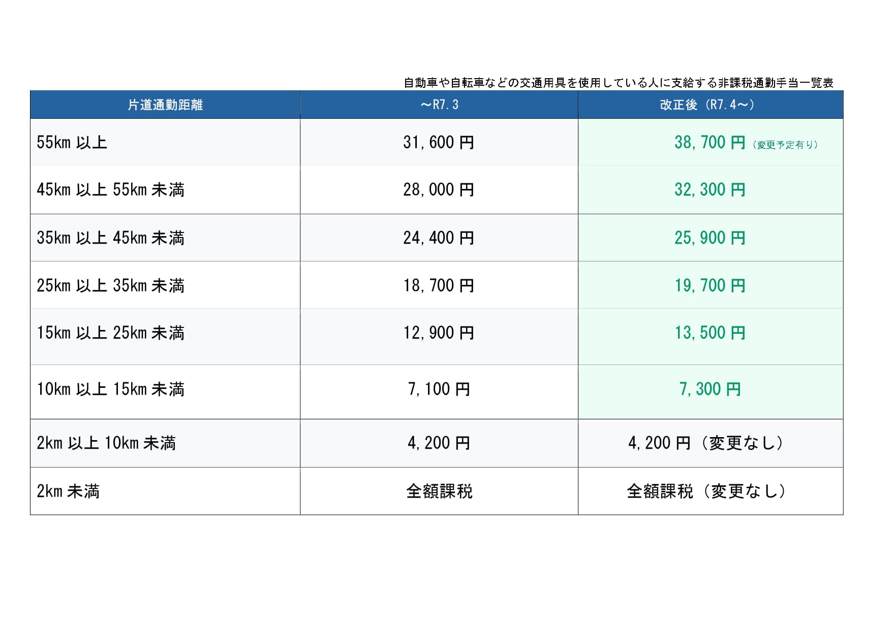 マイカー・自転車など交通用具を使用するケース(距離別限度額)以下の通り、通勤距離に応じた非課税限度額が引き上げられました(1か月当たり)。