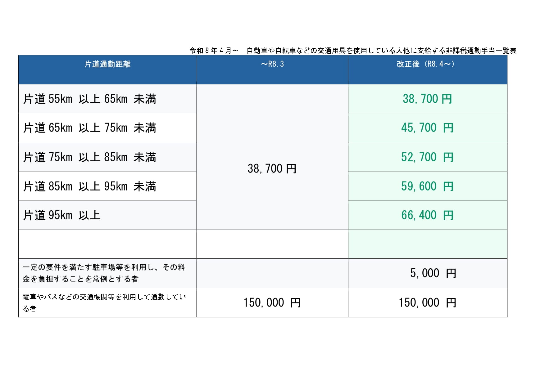 改正所得税法に基づき、令和8年4月から自動車等通勤者向けの通勤手当についてさらなる拡充が盛り込まれました。片道60km以上について5km刻みで100km以上まで新たな距離区分が設けられ、最高額は月額66,400円(片道95km以上)まで引き上げられる予定です。