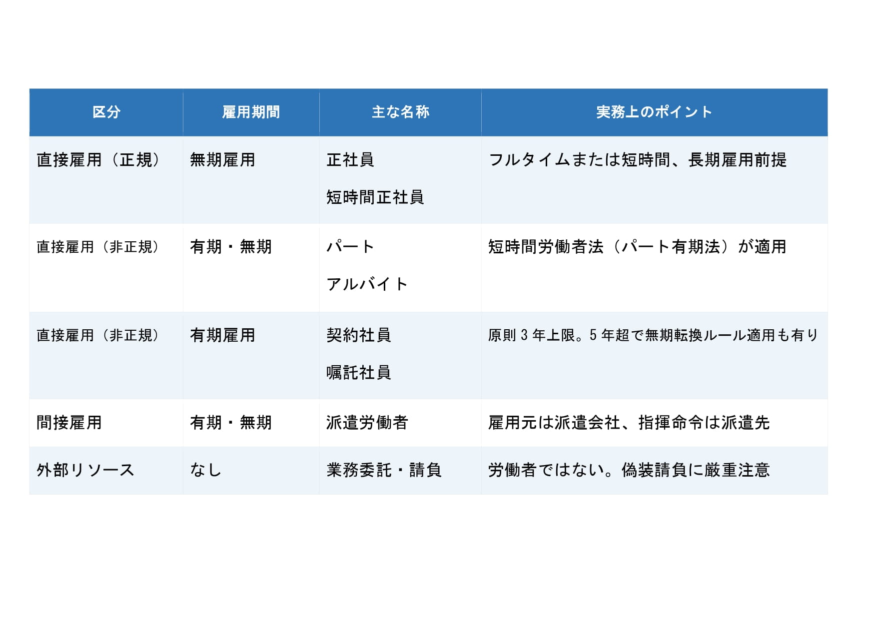 企業が活用する雇用形態は大きく「直接雇用」「間接雇用」「外部リソース(非雇用)」の3区分に整理できます。下表で全体像を把握したうえで、各形態の詳細を確認してください。