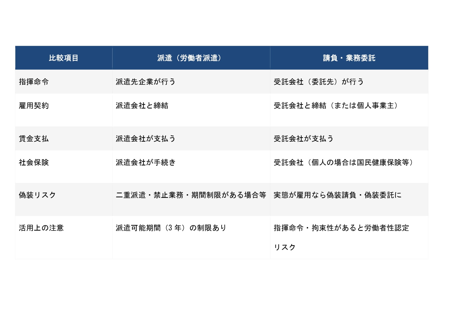 「派遣」と「請負(業務委託)」は、いずれも「自社以外の人材を活用する」点で共通しますが、法的な構造は全く異なります。この違いを誤認すると、「偽装請負」という重大な法令違反に直結します。